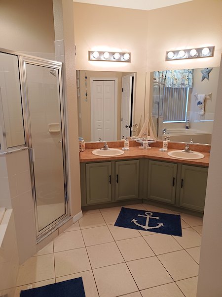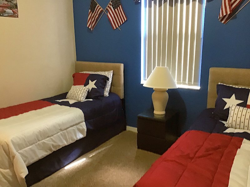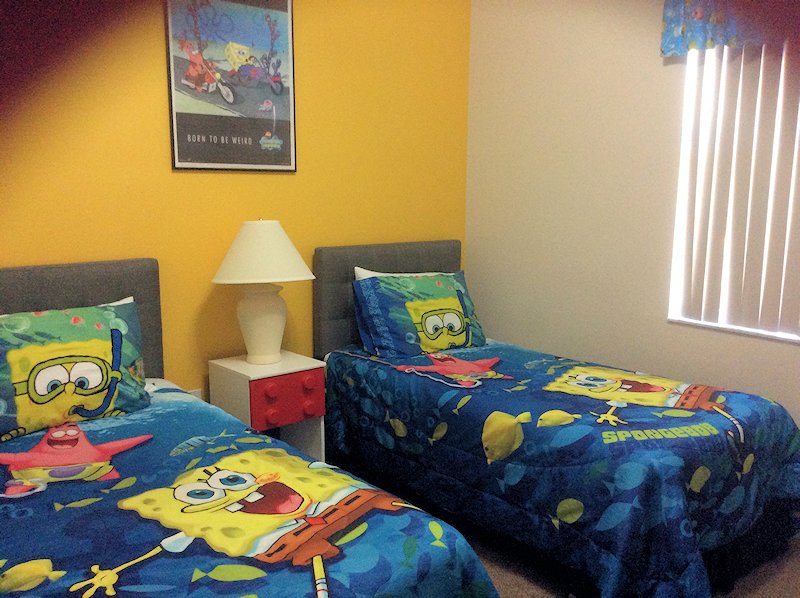 Master bedroom 2 King bed with luxurious comforter set in pale blue and beige with cream cotton thread sheets. Flat screen TV with ROKU, DVD player, large dressing table with drawers, and two bedside tables with drawers. Private en-suite bathroom, shower over the bath, toilet, single wash basins in a vanity unit, with hairdryers, tongs, and straighteners. Own private door leading to the patio area and pool. Americano Themed Twin bedroom Two single beds with luxurious stars and stripes bedding, black finished bedside lamp stand, large drawer dresser, flat screen TV with ROKU, DVD player, CD player, CDs, and closet. SpongBob Themed Twin Bedroom Two single beds with a SpongBob comforter and sheets, Lego bedside lamp stand, Lego drawers, XBOX, games, and closet. Shared bathroom adjacent to the lounge by the twin bedrooms for easy access, shower over the bath, toilet, single wash hand basin, and vanity unit, with hairdryers, tongs, and straighteners. All beds are fitted with good quality hotel mattresses that have been renewed and fitted with bed bug protectors and mattress and pillow covers. All bedding is renewed on a yearly basis, including pillows, to ensure the villa gives that fresh feeling to all our guests. Pool Area & Outdoors28ft South facing pool and spa with water sprays and streamers. We have one of the largest pools at Towerlakes; most villas only offer the standard-sized pool. We bought our villa before it was built, and the pool was custom-made for our requirements. Pool area is furnished with Palm casual furniture for extra comfort for our guests, 6 sun loungers, 4 side drinks tables, 2 7ft umbrellas, two comfortable high back chairs, a patio table and four chairs, two reclining chairs, and footstools.